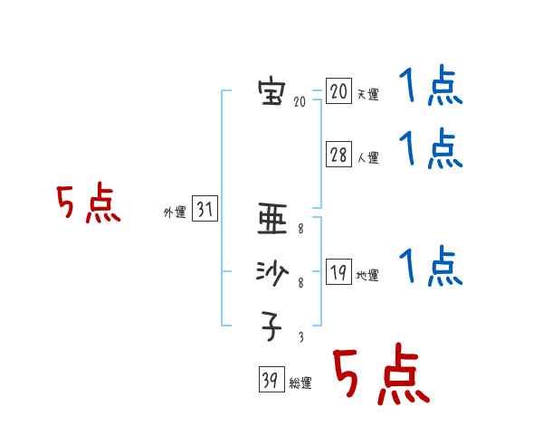 外運![]() | 宝亜沙子さんの外運は31画の5つ星!社交性があり判断力に優れる。順風満帆な人生で円満な生活。 生活面を象徴する運勢です。外部から受ける影響力を表し、結婚運、家庭運や職場、環境への順応性を表します。 |