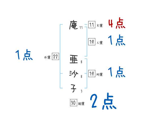 天運![]() | 庵亜沙子さんの天運は11画の4つ星!着実に富や地位を得る幸運な人生。 家系が持つ宿命的な運勢を表します。祖先から受け継いだ苗字ですので自分の力が及びません。家柄を象徴します。 |