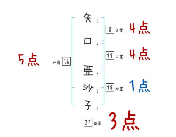 天運![]() | 矢口亜沙子さんの天運は8画の4つ星!勤勉家。根気強く努力し成功する。忍耐力がある。 家系が持つ宿命的な運勢を表します。祖先から受け継いだ苗字ですので自分の力が及びません。家柄を象徴します。 |