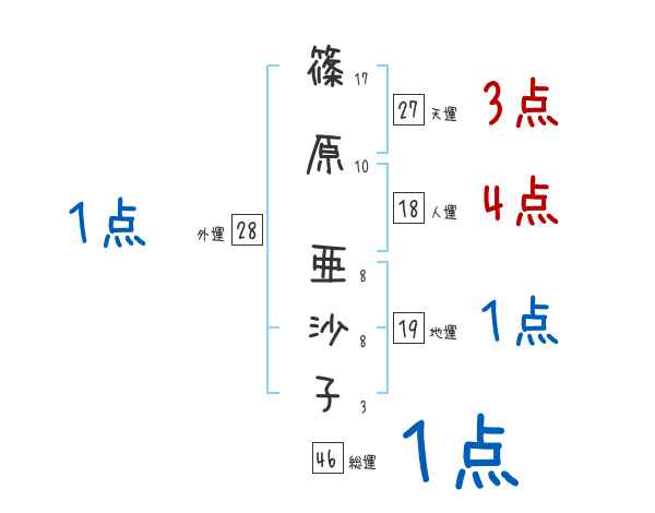 外運![]() | 篠原亜沙子さんの外運は28画の1つ星!家庭環境に注意。スポーツで活躍できる能力があるかも。 生活面を象徴する運勢です。外部から受ける影響力を表し、結婚運、家庭運や職場、環境への順応性を表します。 |