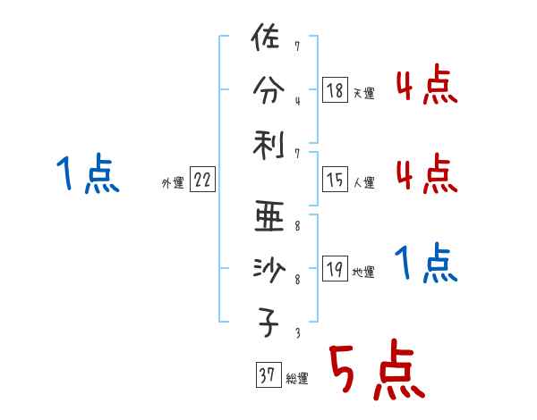 天運![]() | 佐分利亜沙子さんの天運は18画の4つ星!情熱的で剛気。忍耐力があり信頼される。 家系が持つ宿命的な運勢を表します。祖先から受け継いだ苗字ですので自分の力が及びません。家柄を象徴します。 |