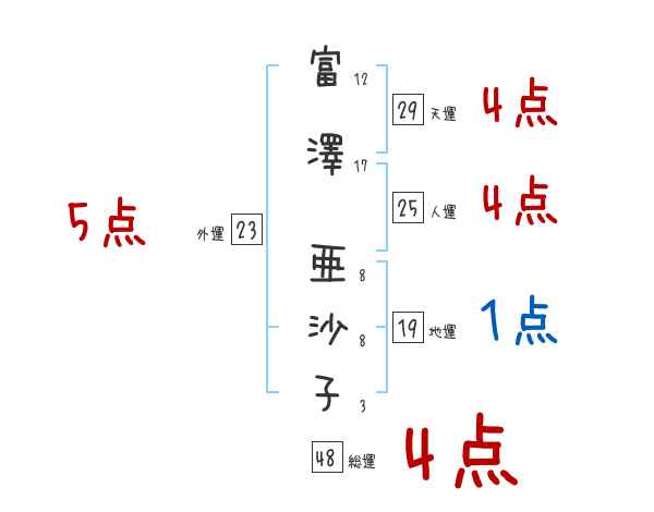 外運![]() | 富澤亜沙子さんの外運は23画の5つ星!想像力に優れ活力がある。一代で成功し名誉を手に入れる。 生活面を象徴する運勢です。外部から受ける影響力を表し、結婚運、家庭運や職場、環境への順応性を表します。 |