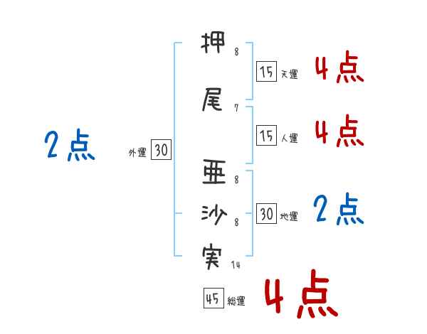 総運![]() | 押尾亜沙実さんの総運は45画の4つ星!もくもくと物事を進め達成する。地味な努力家。 あなたの人生を表す1番重要な運勢です。生涯を通じて影響する総合運となり、主に50歳以降の晩年期に影響を及ぼします。 |