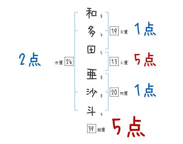 外運![]() | 和多田亜沙斗さんの外運は26画の2つ星!波瀾万丈かも。信頼できる人を大事にしましょう。 生活面を象徴する運勢です。外部から受ける影響力を表し、結婚運、家庭運や職場、環境への順応性を表します。 |