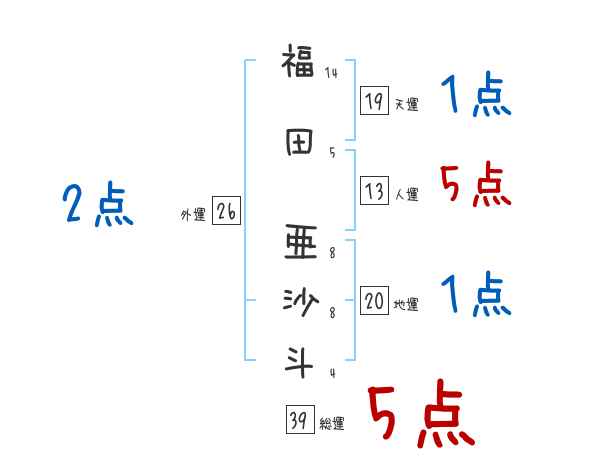 外運![]() | 福田亜沙斗さんの外運は26画の2つ星!波瀾万丈かも。信頼できる人を大事にしましょう。 生活面を象徴する運勢です。外部から受ける影響力を表し、結婚運、家庭運や職場、環境への順応性を表します。 |