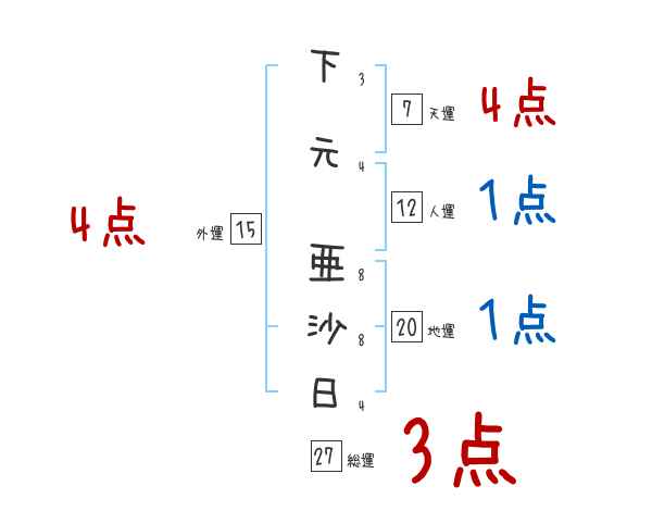 天運![]() | 下元亜沙日さんの天運は7画の4つ星!強い意志や信念を持ち独立心が強い。自立する。 家系が持つ宿命的な運勢を表します。祖先から受け継いだ苗字ですので自分の力が及びません。家柄を象徴します。 |