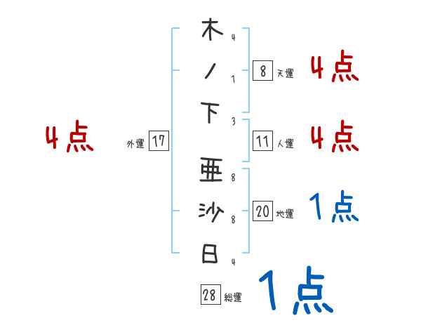 外運![]() | 木ノ下亜沙日さんの外運は17画の4つ星!積極的な行動力。地位を気づき財産を手に入れる。純粋な心と直感力。 生活面を象徴する運勢です。外部から受ける影響力を表し、結婚運、家庭運や職場、環境への順応性を表します。 |
