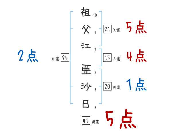 天運![]() | 祖父江亜沙日さんの天運は21画の5つ星!統率力がある。独立し成功する。名誉を手に入れる。 家系が持つ宿命的な運勢を表します。祖先から受け継いだ苗字ですので自分の力が及びません。家柄を象徴します。 |