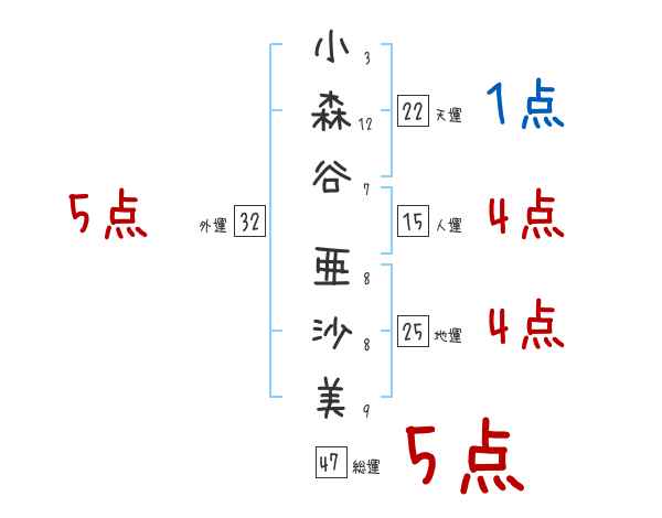 外運![]() | 小森谷亜沙美さんの外運は32画の5つ星!柔軟性があり成功する。チャンスが多く金運が良い。 生活面を象徴する運勢です。外部から受ける影響力を表し、結婚運、家庭運や職場、環境への順応性を表します。 |