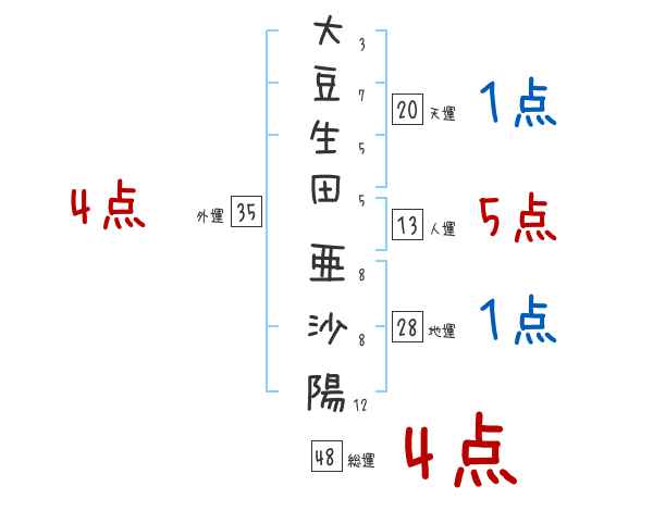 総運![]() | 大豆生田亜沙陽さんの総運は48画の4つ星!賢明な性格で人望が厚い。指導力があり多くの人に尊敬される。 あなたの人生を表す1番重要な運勢です。生涯を通じて影響する総合運となり、主に50歳以降の晩年期に影響を及ぼします。 |