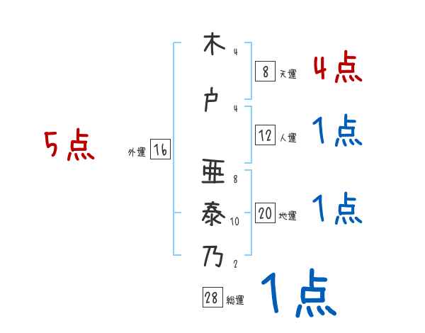 総運![]() | 木戸亜泰乃さんの総運は28画の1つ星!家庭環境に注意。スポーツで活躍できる能力があるかも。 あなたの人生を表す1番重要な運勢です。生涯を通じて影響する総合運となり、主に50歳以降の晩年期に影響を及ぼします。 |