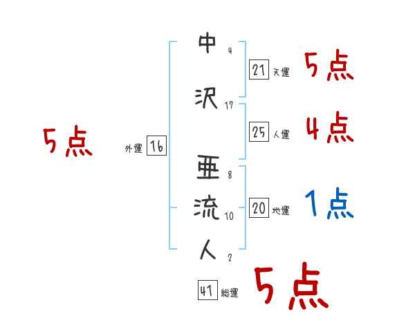 外運![]() | 中沢亜流人さんの外運は16画の5つ星!人望が厚く大きく発展する。逆転成功が見える。 生活面を象徴する運勢です。外部から受ける影響力を表し、結婚運、家庭運や職場、環境への順応性を表します。 |