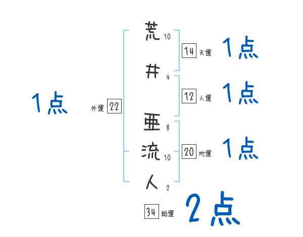 天運![]() | 荒井亜流人さんの天運は14画の1つ星!人に対して優しいがストレスを溜め込みがち。人間関係のトラブルを避けるよう気をつけましょう。 家系が持つ宿命的な運勢を表します。祖先から受け継いだ苗字ですので自分の力が及びません。家柄を象徴します。 |