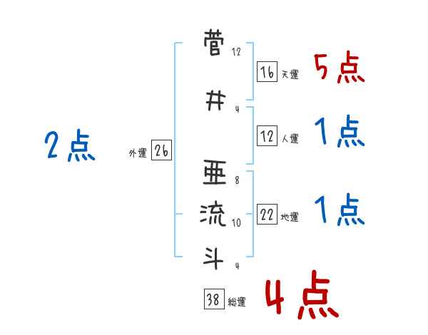 外運![]() | 菅井亜流斗さんの外運は26画の2つ星!波瀾万丈かも。信頼できる人を大事にしましょう。 生活面を象徴する運勢です。外部から受ける影響力を表し、結婚運、家庭運や職場、環境への順応性を表します。 |