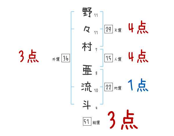 天運![]() | 野々村亜流斗さんの天運は29画の4つ星!完全主義で才能がある。厳格な心の持ち主。 家系が持つ宿命的な運勢を表します。祖先から受け継いだ苗字ですので自分の力が及びません。家柄を象徴します。 |