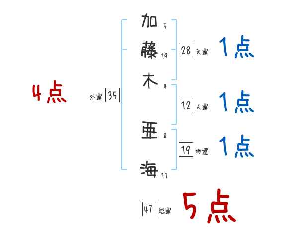 天運![]() | 加藤木亜海さんの天運は28画の1つ星!家庭環境に注意。スポーツで活躍できる能力があるかも。 家系が持つ宿命的な運勢を表します。祖先から受け継いだ苗字ですので自分の力が及びません。家柄を象徴します。 |