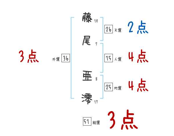 天運![]() | 藤尾亜澪さんの天運は26画の2つ星!波瀾万丈かも。信頼できる人を大事にしましょう。 家系が持つ宿命的な運勢を表します。祖先から受け継いだ苗字ですので自分の力が及びません。家柄を象徴します。 |