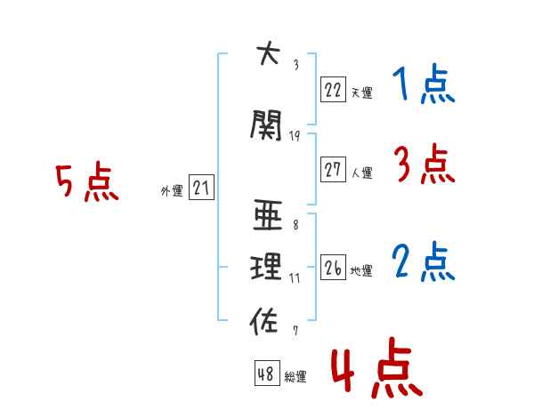 人運![]() | 大関亜理佐さんの人運は27画の3つ星!頭脳明晰だが強情で摩擦が多い傾向。孤立に注意。 性格や才能などを表す2番目に重要な運勢です。人間関係や協調性、社会的な成功に影響します。主に20歳から50歳ぐらいまでの中年期の運勢を表します。 |