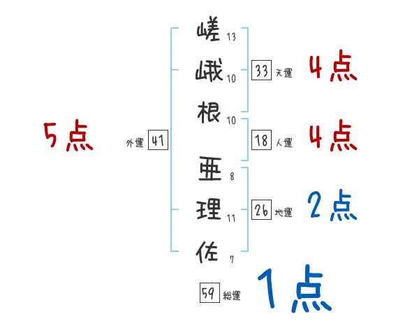 天運![]() | 嵯峨根亜理佐さんの天運は33画の4つ星!権力志向でプライドが高い。勇気があり運を切り開き成功する。 家系が持つ宿命的な運勢を表します。祖先から受け継いだ苗字ですので自分の力が及びません。家柄を象徴します。 |