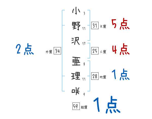 外運![]() | 小野沢亜理咲さんの外運は34画の2つ星!独創性に優れるが、自尊心が強く災難に注意しましょう。 生活面を象徴する運勢です。外部から受ける影響力を表し、結婚運、家庭運や職場、環境への順応性を表します。 |