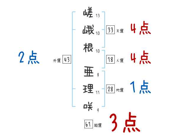 天運![]() | 嵯峨根亜理咲さんの天運は33画の4つ星!権力志向でプライドが高い。勇気があり運を切り開き成功する。 家系が持つ宿命的な運勢を表します。祖先から受け継いだ苗字ですので自分の力が及びません。家柄を象徴します。 |