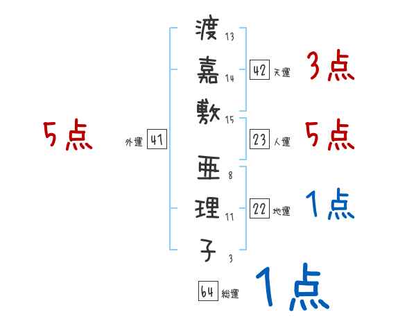 天運![]() | 渡嘉敷亜理子さんの天運は42画の3つ星!病気に注意。多芸であるが消極的でおとなしい。 家系が持つ宿命的な運勢を表します。祖先から受け継いだ苗字ですので自分の力が及びません。家柄を象徴します。 |