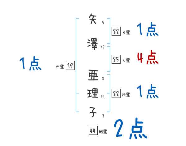 天運![]() | 矢澤亜理子さんの天運は22画の1つ星!努力することが苦手ないっぽう手先が器用。芸術性にも優れる。 家系が持つ宿命的な運勢を表します。祖先から受け継いだ苗字ですので自分の力が及びません。家柄を象徴します。 |