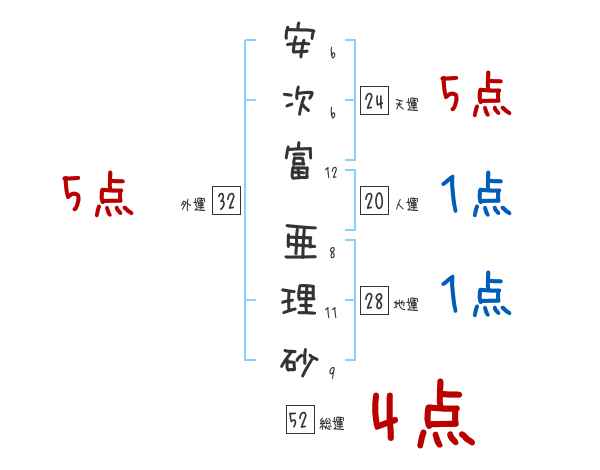 外運![]() | 安次富亜理砂さんの外運は32画の5つ星!柔軟性があり成功する。チャンスが多く金運が良い。 生活面を象徴する運勢です。外部から受ける影響力を表し、結婚運、家庭運や職場、環境への順応性を表します。 |