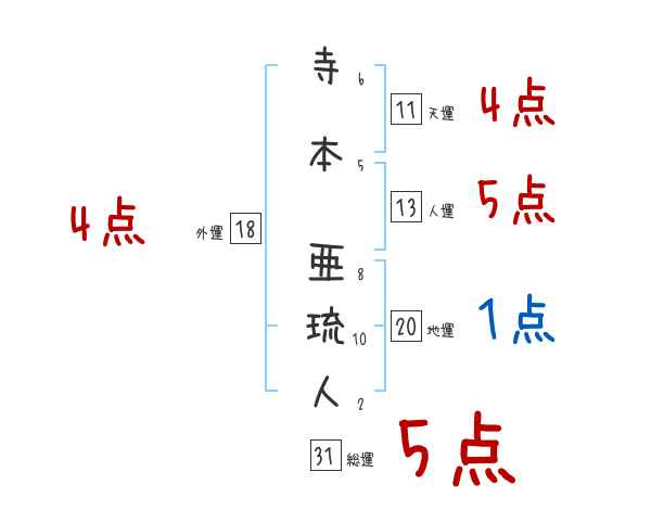 天運![]() | 寺本亜琉人さんの天運は11画の4つ星!着実に富や地位を得る幸運な人生。 家系が持つ宿命的な運勢を表します。祖先から受け継いだ苗字ですので自分の力が及びません。家柄を象徴します。 |