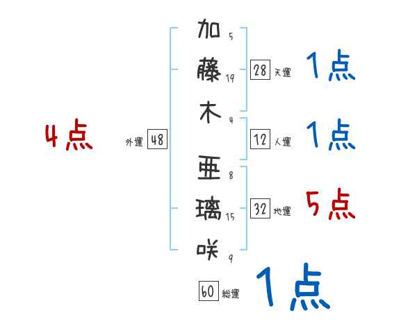 総運![]() | 加藤木亜璃咲さんの総運は60画の1つ星!悲観的で迷いやすい。波乱が多く損をしないように。 あなたの人生を表す1番重要な運勢です。生涯を通じて影響する総合運となり、主に50歳以降の晩年期に影響を及ぼします。 |