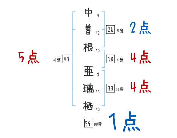 総運![]() | 中曽根亜璃栖さんの総運は59画の1つ星!意志の弱さであきらめることが多いかも。粘り強さが必要。 あなたの人生を表す1番重要な運勢です。生涯を通じて影響する総合運となり、主に50歳以降の晩年期に影響を及ぼします。 |