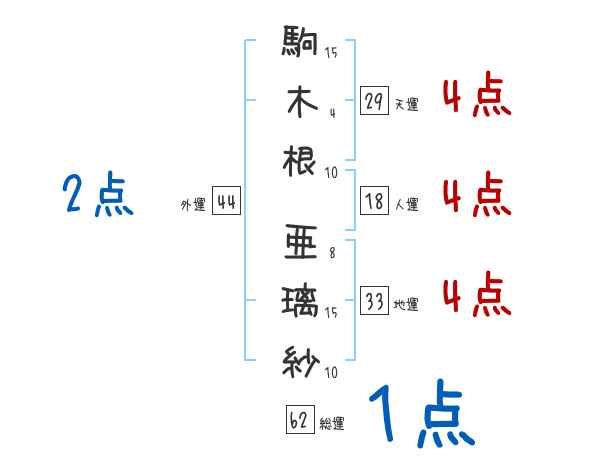 外運![]() | 駒木根亜璃紗さんの外運は44画の2つ星!誠実で慎重な性格。物事を考えすぎないように注意しましょう。 生活面を象徴する運勢です。外部から受ける影響力を表し、結婚運、家庭運や職場、環境への順応性を表します。 |