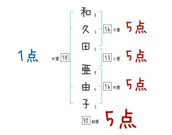 総運![]() | 和久田亜由子さんの総運は32画の5つ星!柔軟性があり成功する。チャンスが多く金運が良い。 あなたの人生を表す1番重要な運勢です。生涯を通じて影響する総合運となり、主に50歳以降の晩年期に影響を及ぼします。 |