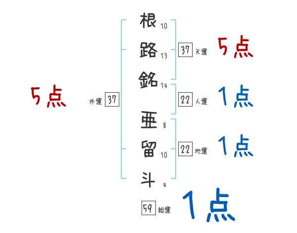 外運![]() | 根路銘亜留斗さんの外運は37画の5つ星!努力家で順応性に優れる。現実的な考え方ができ忠実に物事をこなす。 生活面を象徴する運勢です。外部から受ける影響力を表し、結婚運、家庭運や職場、環境への順応性を表します。 |