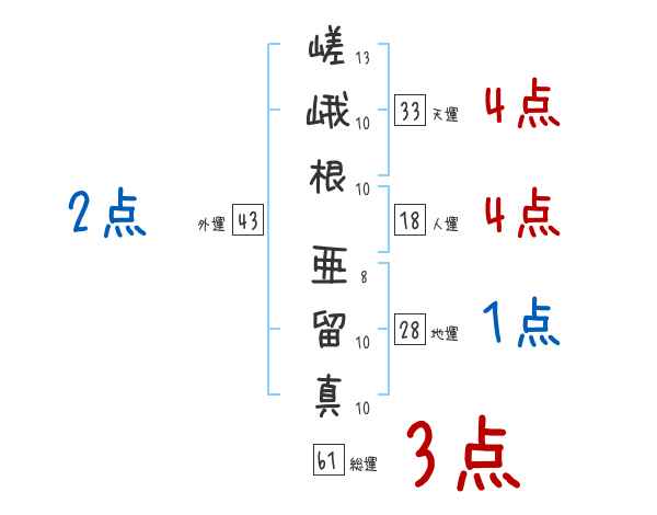 人運![]() | 嵯峨根亜留真さんの人運は18画の4つ星!情熱的で剛気。忍耐力があり信頼される。 性格や才能などを表す2番目に重要な運勢です。人間関係や協調性、社会的な成功に影響します。主に20歳から50歳ぐらいまでの中年期の運勢を表します。 |