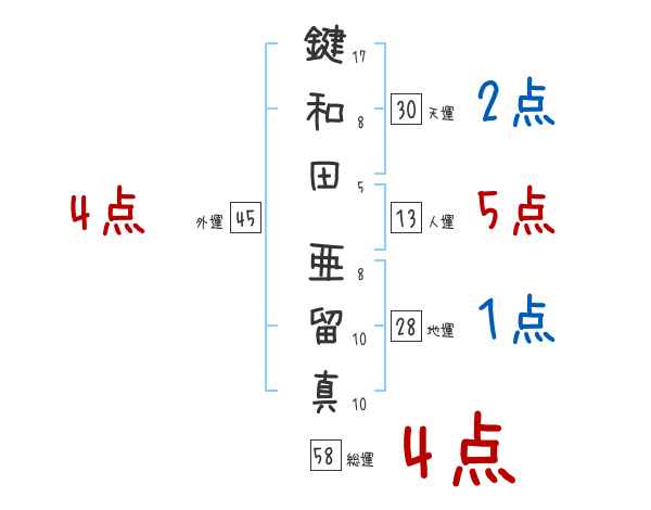 総運![]() | 鍵和田亜留真さんの総運は58画の4つ星!安定した生活。大器晩成タイプ。 あなたの人生を表す1番重要な運勢です。生涯を通じて影響する総合運となり、主に50歳以降の晩年期に影響を及ぼします。 |