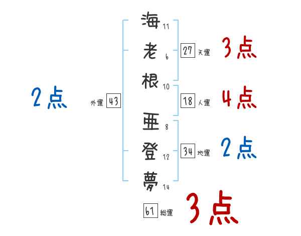 天運![]() | 海老根亜登夢さんの天運は27画の3つ星!頭脳明晰だが強情で摩擦が多い傾向。孤立に注意。 家系が持つ宿命的な運勢を表します。祖先から受け継いだ苗字ですので自分の力が及びません。家柄を象徴します。 |