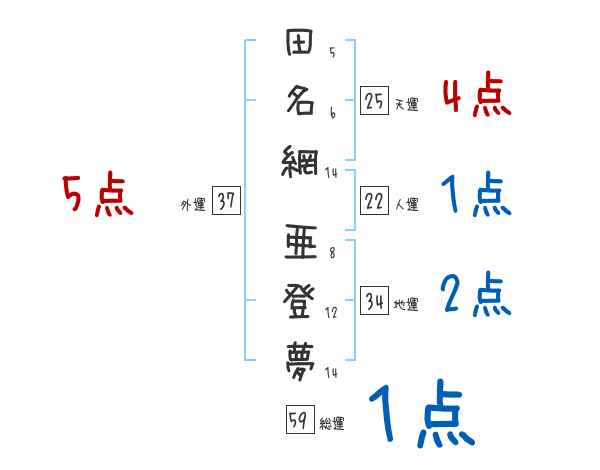 天運![]() | 田名網亜登夢さんの天運は25画の4つ星!個性があり才能があふれる。強運の持ち主で発展する。 家系が持つ宿命的な運勢を表します。祖先から受け継いだ苗字ですので自分の力が及びません。家柄を象徴します。 |