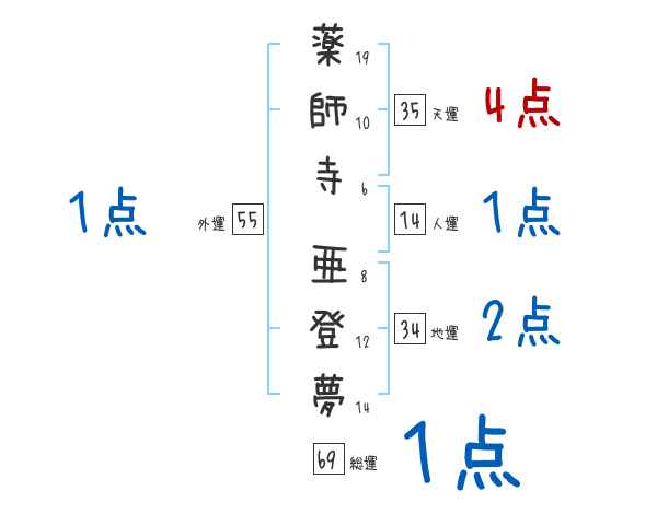 天運![]() | 薬師寺亜登夢さんの天運は35画の4つ星!温厚な性格で感受性が高い。穏和な性格で人望が厚い。 家系が持つ宿命的な運勢を表します。祖先から受け継いだ苗字ですので自分の力が及びません。家柄を象徴します。 |