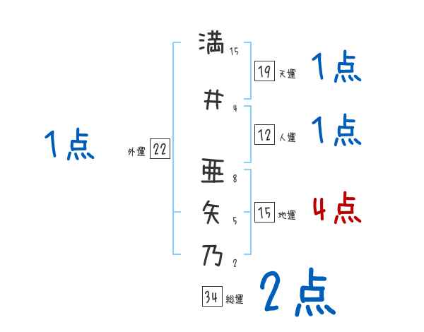 外運![]() | 満井亜矢乃さんの外運は22画の1つ星!努力することが苦手ないっぽう手先が器用。芸術性にも優れる。 生活面を象徴する運勢です。外部から受ける影響力を表し、結婚運、家庭運や職場、環境への順応性を表します。 |