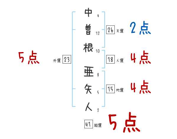 外運![]() | 中曽根亜矢人さんの外運は23画の5つ星!想像力に優れ活力がある。一代で成功し名誉を手に入れる。 生活面を象徴する運勢です。外部から受ける影響力を表し、結婚運、家庭運や職場、環境への順応性を表します。 |
