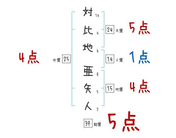 天運![]() | 対比地亜矢人さんの天運は24画の5つ星!家庭運が良く順調な人生。金運にも恵まれる。 家系が持つ宿命的な運勢を表します。祖先から受け継いだ苗字ですので自分の力が及びません。家柄を象徴します。 |