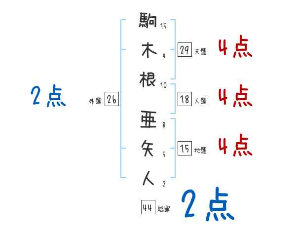 総運![]() | 駒木根亜矢人さんの総運は44画の2つ星!誠実で慎重な性格。物事を考えすぎないように注意しましょう。 あなたの人生を表す1番重要な運勢です。生涯を通じて影響する総合運となり、主に50歳以降の晩年期に影響を及ぼします。 |