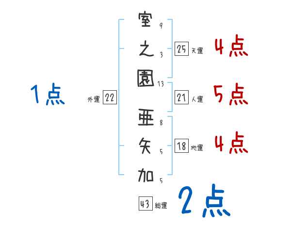 天運![]() | 室之園亜矢加さんの天運は25画の4つ星!個性があり才能があふれる。強運の持ち主で発展する。 家系が持つ宿命的な運勢を表します。祖先から受け継いだ苗字ですので自分の力が及びません。家柄を象徴します。 |