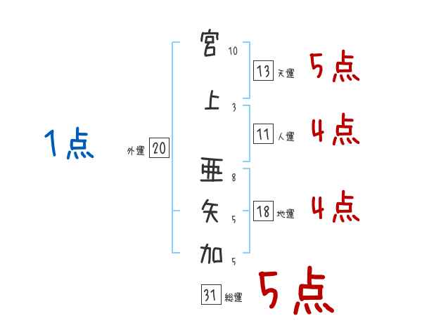 総運![]() | 宮上亜矢加さんの総運は31画の5つ星!社交性があり判断力に優れる。順風満帆な人生で円満な生活。 あなたの人生を表す1番重要な運勢です。生涯を通じて影響する総合運となり、主に50歳以降の晩年期に影響を及ぼします。 |