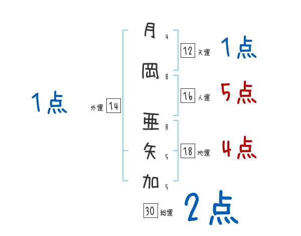 人運![]() | 月岡亜矢加さんの人運は16画の5つ星!人望が厚く大きく発展する。逆転成功が見える。 性格や才能などを表す2番目に重要な運勢です。人間関係や協調性、社会的な成功に影響します。主に20歳から50歳ぐらいまでの中年期の運勢を表します。 |