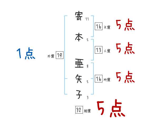 総運![]() | 寄本亜矢子さんの総運は32画の5つ星!柔軟性があり成功する。チャンスが多く金運が良い。 あなたの人生を表す1番重要な運勢です。生涯を通じて影響する総合運となり、主に50歳以降の晩年期に影響を及ぼします。 |