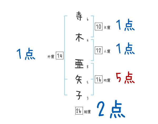 総運![]() | 寺木亜矢子さんの総運は26画の2つ星!波瀾万丈かも。信頼できる人を大事にしましょう。 あなたの人生を表す1番重要な運勢です。生涯を通じて影響する総合運となり、主に50歳以降の晩年期に影響を及ぼします。 |