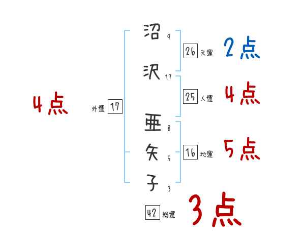 外運![]() | 沼沢亜矢子さんの外運は17画の4つ星!積極的な行動力。地位を気づき財産を手に入れる。純粋な心と直感力。 生活面を象徴する運勢です。外部から受ける影響力を表し、結婚運、家庭運や職場、環境への順応性を表します。 |