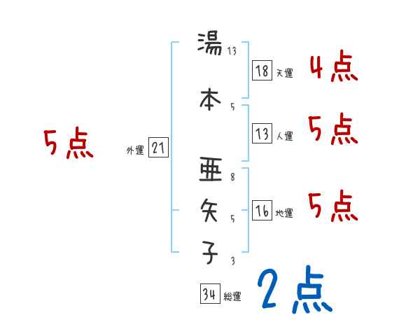 外運![]() | 湯本亜矢子さんの外運は21画の5つ星!統率力がある。独立し成功する。名誉を手に入れる。 生活面を象徴する運勢です。外部から受ける影響力を表し、結婚運、家庭運や職場、環境への順応性を表します。 |